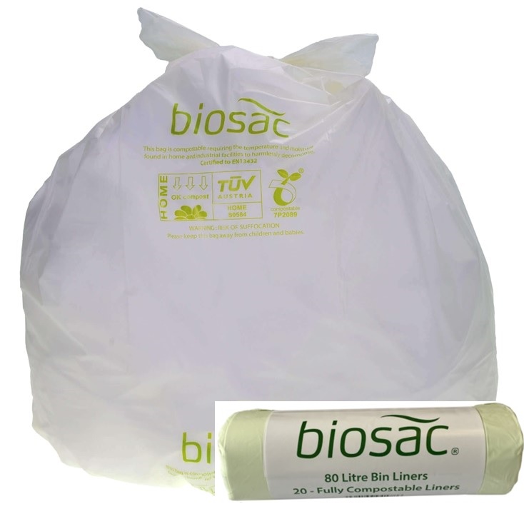 80litre Biosac compostable bin liners are certified to EN 13432, ensuring you can be confident they will decompose in home or industrial composting facilities. They are supplied in a handy 80litresize. The roll of 20 is perforated for easy dispensing. Each bag has been manufactured from corn starch and other plant extracts and carries the compostable seedling logo, which is approved for use with council food waste recycling schemes. The bag material is easily compostable and biodegradable to water, CO2 and residual organic carbon, leaving no harmful residues.