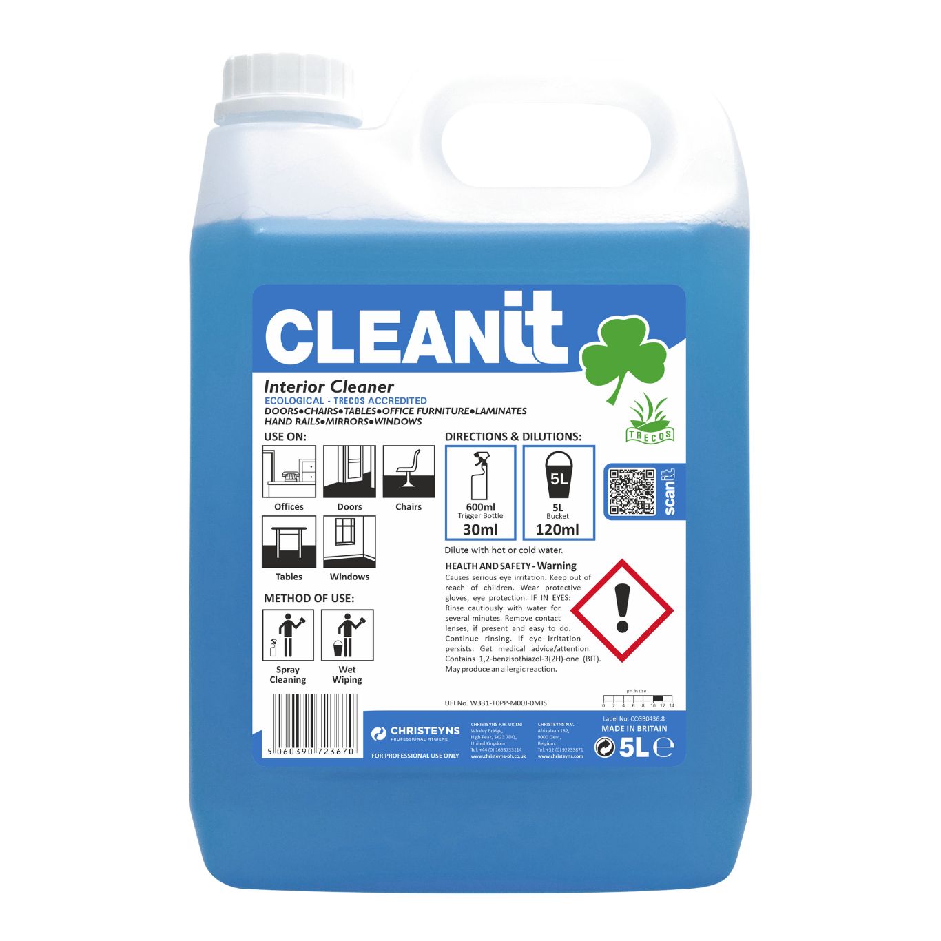 CLEANiT is a viscous blue liquid which leaves a fresh fragrance. It can be applied with a trigger spray, diluted at a rate of 1:20, or by a mop and bucket, diluted at 1:40.