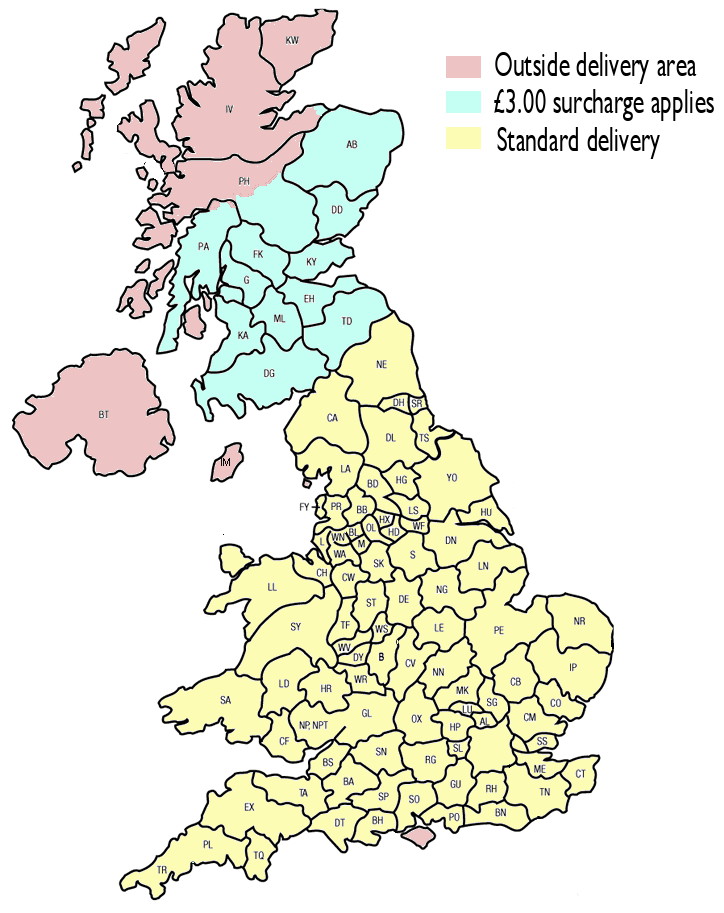 In certain remote areas, an additional £3.00 surcharge will be automatically applied at checkout, and some areas are excluded from our delivery service entirely.  See below for further information about our delivery areas.