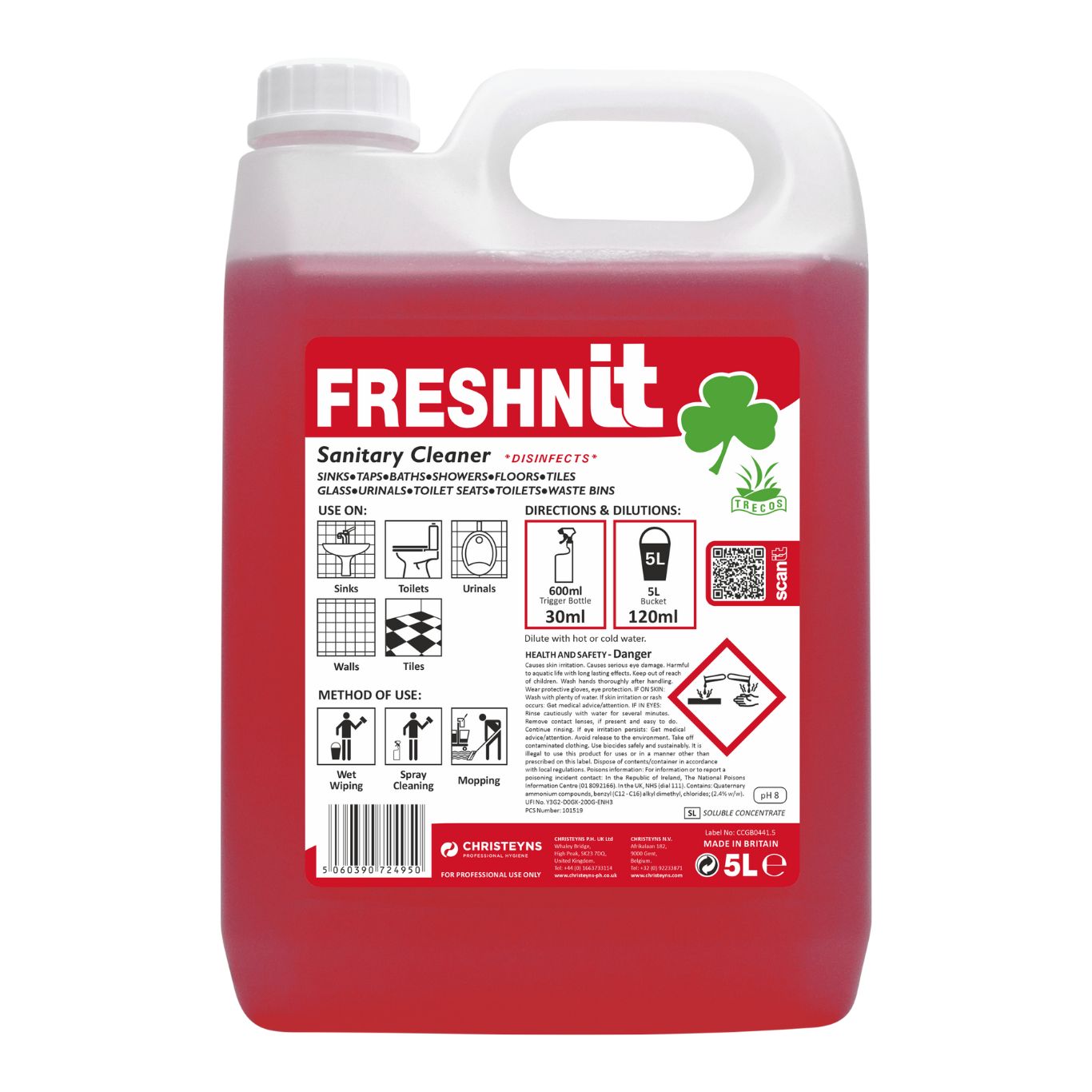 FRESHNiT is a pH-neutral, perfumed sanitary cleaner from CLOVER CHEMICALS which cleans, disinfects and neutralizes odours to leave a long-lasting fragrance. It contains a blend of emulsifiers, surfactants and bactericides which effectively dissolve body fats.