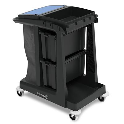 Providing the benefit of enclosed storage trolley in a small, compact design, the ECO-Matic EM2 Cleaning Trolley offers a generous 120L waste bin facility, 2 deep lockable storage drawers and top storage tray for all your cleaning equipment and supplies.