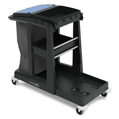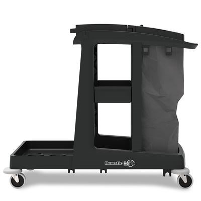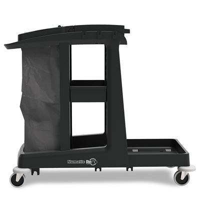 Providing the convenience of open shelf storage in a mid size trolley, the Numatic ECO-Matic EM3 cleaning trolley offers a generous 120L waste facility, easy access shelf storage, top tray storage & a front storage unit.