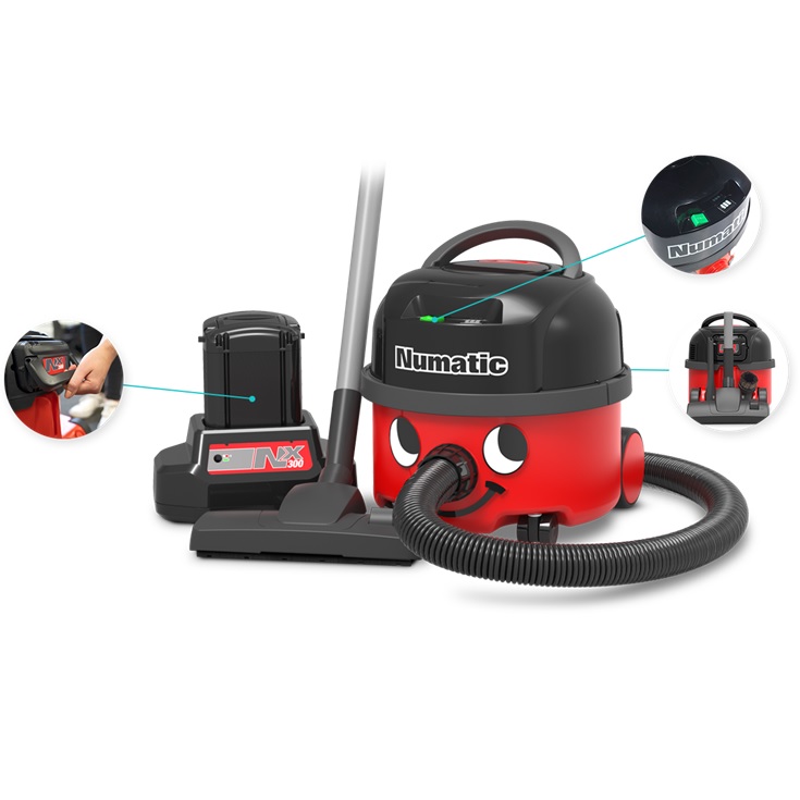 The NUMATIC NBV190NX BATTERY VACUUM CLEANER features classic NUMATIC HENRY styling, whilst combining excellent performance and professional standard dry vacuum cleaning.  Its cordless design makes it an ideal solution in difficult situations, such as in confined spaces with public present, reducing the risk of health and safety issues - it conveniently weighs just over 7kg.