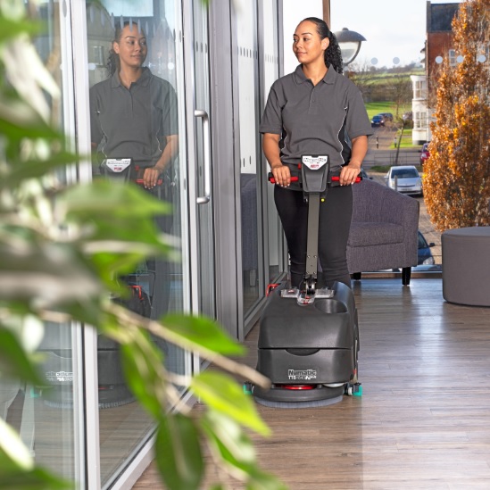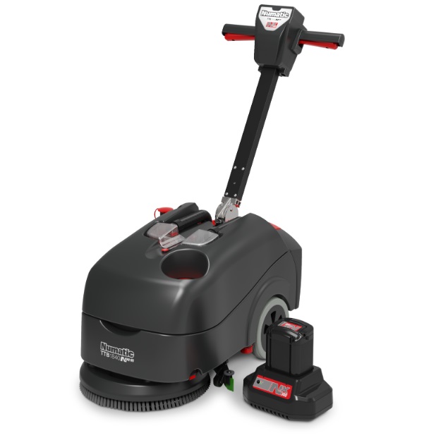The new Numatic TTB1840NX-R battery scrubber dryer features a high performance digital motor, powerful NX300 36v lithium battery and patented centrifugal water feed on the brush.