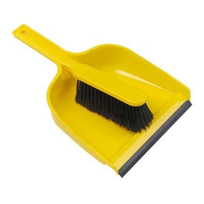 The DUSTPAN AND BRUSH SET features an 8" wide plastic dustpan, with a rubberized scoop and rimmed edge for more secure dust gathering; it comes complete with a soft-bristled banister brush featuring PVC fibres.