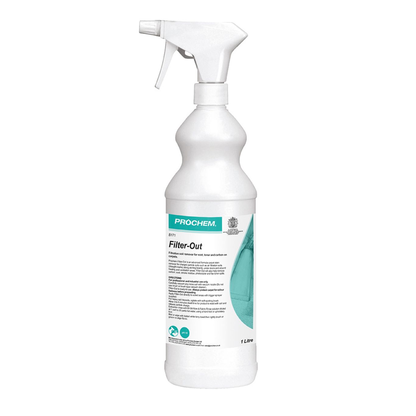 PROCHEM FILTER-OUT is a carpet stain remover formulated for charged particle soiling which occurs around vents, filtration systems and under doors and skirting boards. It is also effective against toner spills, soot and carbon. It is intended for professional use.