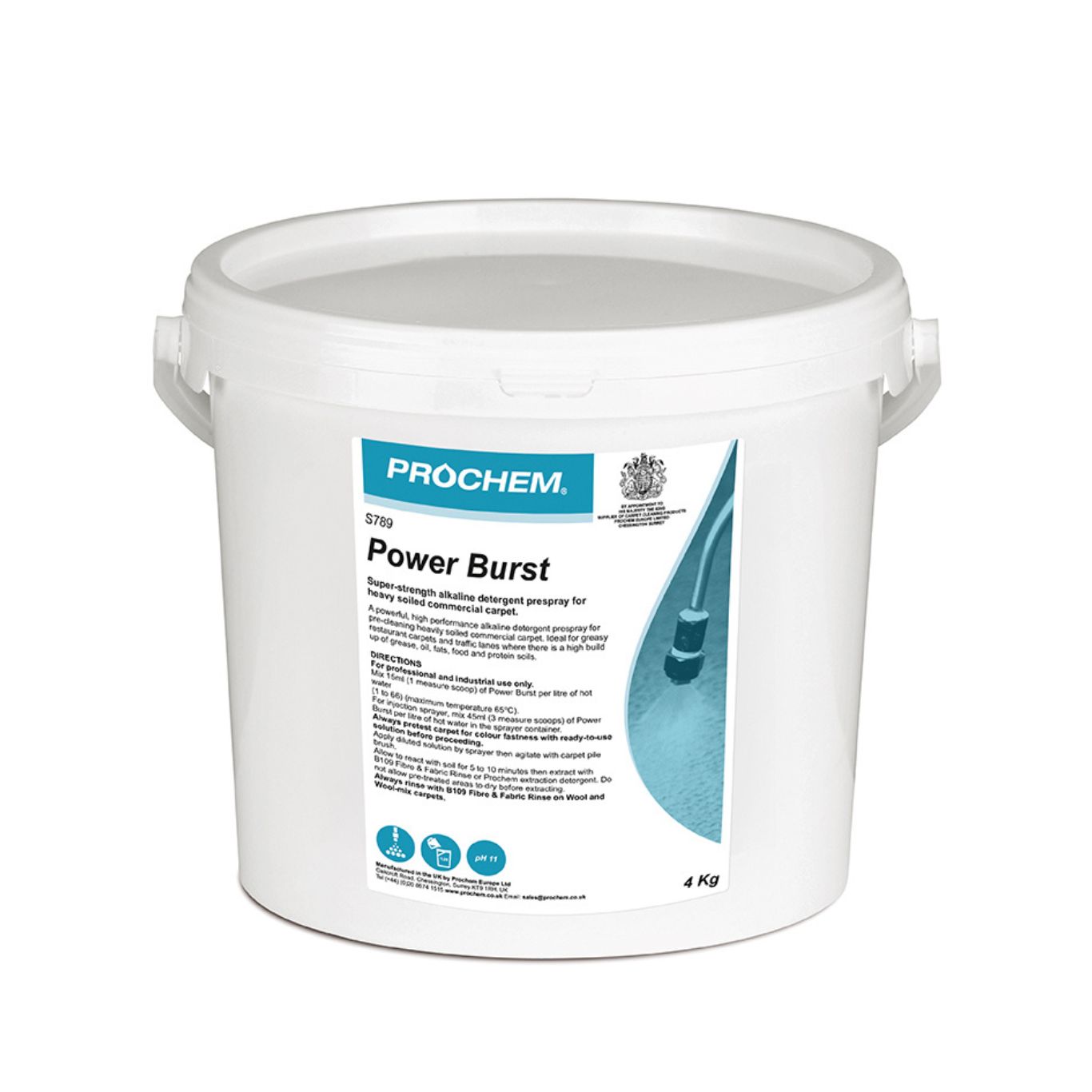 POWER BURST is a powerful, professional, detergent pre-spray for high performance pre-cleaning of heavily soiled commercial carpets.  It is ideal for use on greasy carpets with a high build up of oil, food and fats, and those with heavy traffic; it is particularly recommended for use in restaurants, leaving a fresh, floral fragrance.
